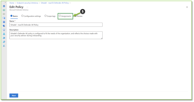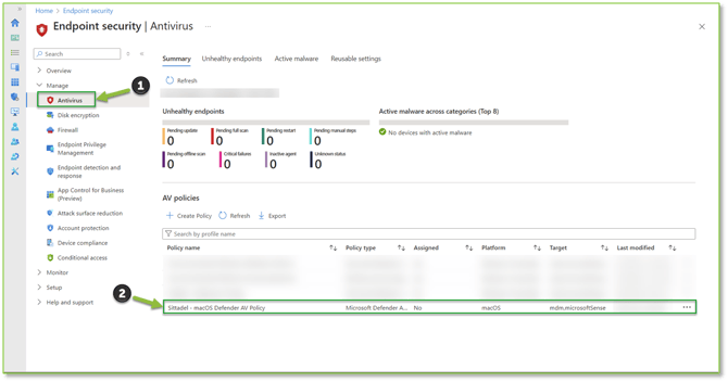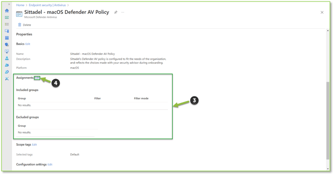 - Once all the necessary assignments have been made for all of the configuration profiles, we will Navigate to the Antivirus – Intune portal, here we will want to locate and select the Sittadel – macOS Defender AV Policy to begin the policy assignment process.