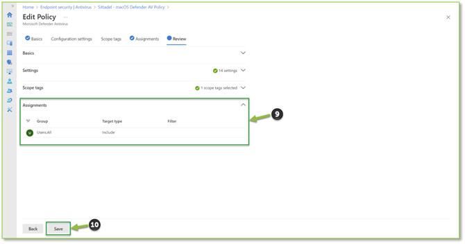 - From the Review section, we will want to select the Assignments dropdown to verify that the previous assignment(s) have been made correctly. If the desired group(s) is generating, we will select Save to finalize the Anti-Virus policy assignment.