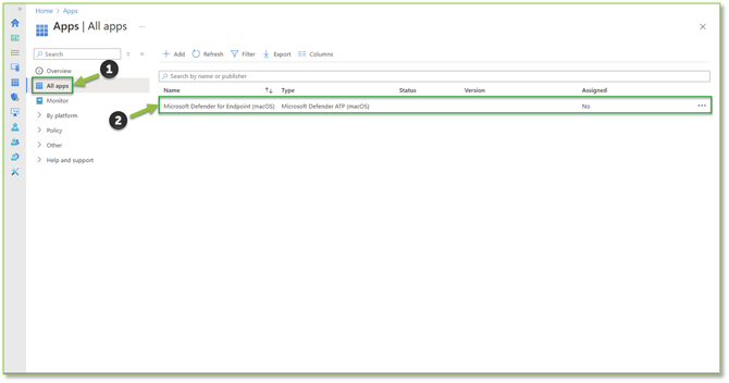 - Once all the necessary assignments have been made for the Anti-virus policy, we will Navigate to the All Apps – Intune portal, here we will want to locate and select the Microsoft Defender for Endpoint (macOS) application to begin the policy assignment process.