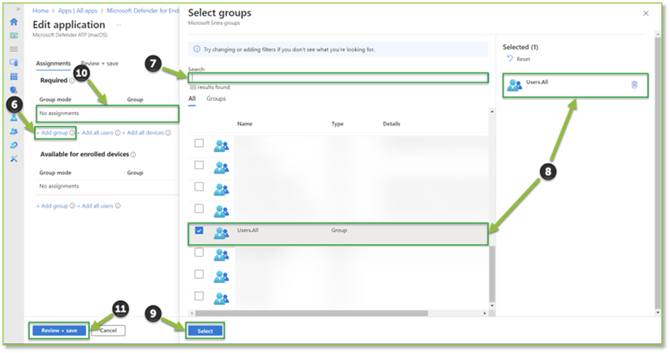 - From the Assignments section, utilize the Add groups button, this will display a pop-out where leveraging the search bar you can supply the name for the desired groups that you wish to have the MDE enforcement on. Make sure that you select the checkbox by the returned group from the list, finalize this selection by hitting Select. The selected groups should generate in the list once the pop-out is terminated. Select Review + save to continue to assignment finalization.