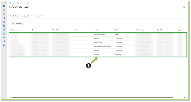 - Navigate to the Device Actions Report – Intune portal, here you will see a list of requested device actions and their statuses. This information is essential for maintaining compliance, enhancing security, and optimizing your audit processes.
