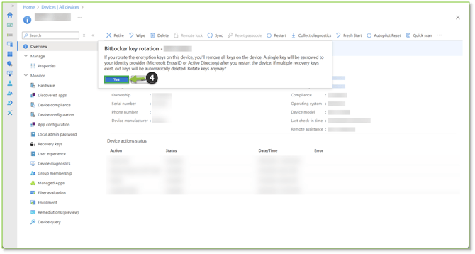 - A prompt will generate asking if you are sure you want to follow through with doing a key rotation on the device, select Yes to complete the BitLocker key rotation action initiation process.
