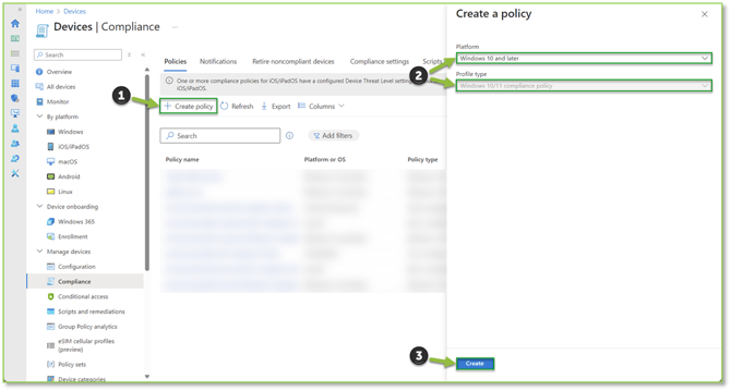 - Navigate to the Compliance Policies – Intune portal, locate and select Create Policy. A pop-out will be generated where you will be able to specify an Operating System Platform scope, the Profile Type will be manually specified based on the OS selection and cannot be modified. Select Create to proceed.