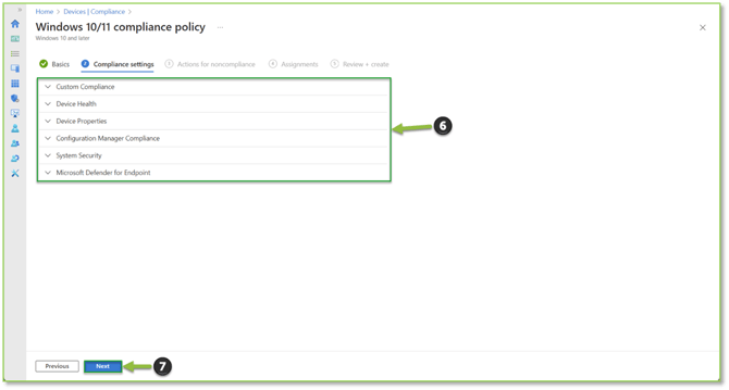 - Next you will see a list of all the configurable settings you can require an onboarded device to meet before it can access the organizational resources. These settings can vary from custom JSON scripts to simple device settings like passwords or drive encryption. Specify the security controls to meet your needs and select Next to proceed.