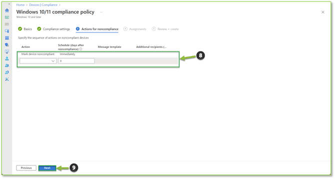 - Following setting configuration, you will decide how noncompliant devices are handled. This can range from just marking the device as noncompliant in Intune, sending an email to the end user notifying them that their device is no longer compliant, or adding the device to a retire list which will offboard the device from Intune management. It will be up to you to decide noncompliance device handling. Select Next to continue.