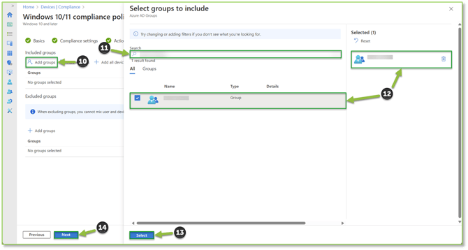 - You will be able to configure Group Assignments or Exclusion for the policy. Locate and select the Add groups action. A pop-up will be displayed where you will supply the name of the group in the provided search bar, make sure to select the Group from the list. If done correctly they will be generated in the Selected Items section, finalize the addition by clicking Select. Select Next to proceed to revisions.