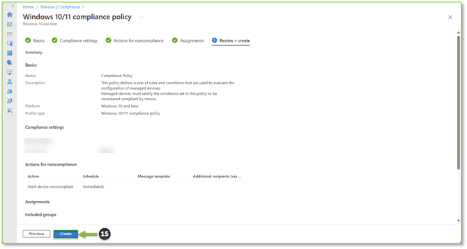 - The review page will allow you to see all configured settings for the profile type creation process, if you detect a discrepancy at this stage make note of the section and select Previous to go back to make the necessary alterations before finalization. If everything checks out, select Create to publish the policy.