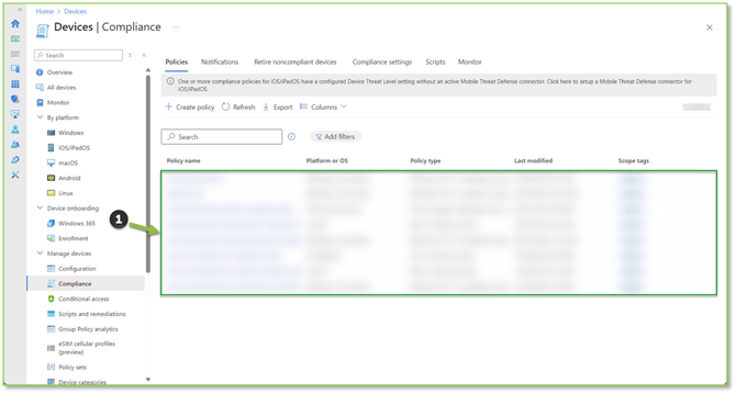 - Navigate to the Compliance Policies – Intune portal, locate and select the policy you wish to alter.