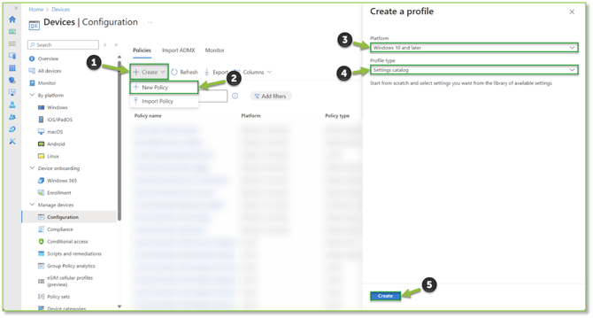 - Navigate to the Configuration Profiles – Intune portal, locate and select the Create dropdown followed by New Policy. A pop-up will be generated where you will be able to specify an Operating System Platform scope and a Profile Type that fits the needs of your security scope. The common profile types are Setting catalog which will display all possible configurable settings on the platform, or Templates which will categorize specific settings depending on the listed security objective it is trying to achieve. Select Create when complete.