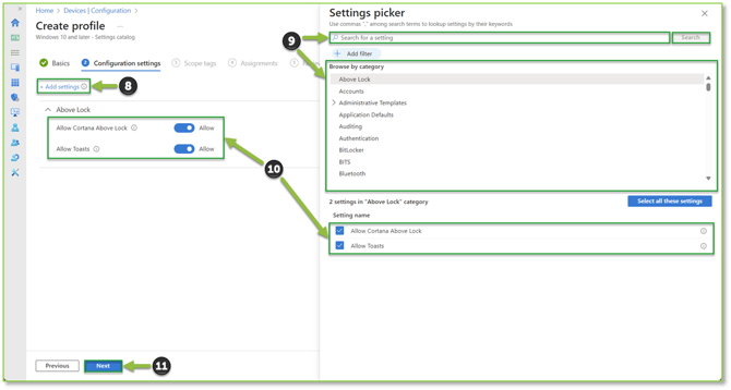 - You will be directed to the settings catalog which has every conceivable setting for the platform that you are interfacing with. Select Add Settings, this will display the Settings Picker which will allow you to search or browse the catalog for applicable settings, selecting the settings under Setting Name will display them in the main area where you can configure the setting using the Radio Button or Value Field Select Next to proceed.