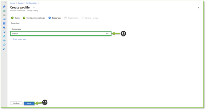 - Scope tag selection can be utilized if desired, it is mainly leveraged with RBAC. Select Next to continue.