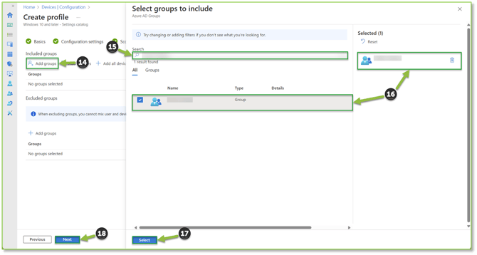 - You will be able to configure Group Assignments or Exclusion for the policy. Locate and select the Add groups action. A pop-up will be displayed where you will supply the name of the group in the provided search bar, make sure to select the Group from the list. If done correctly they will be generated in the Selected Items section, finalize the addition by clicking Select. Select Next to proceed to revisions.