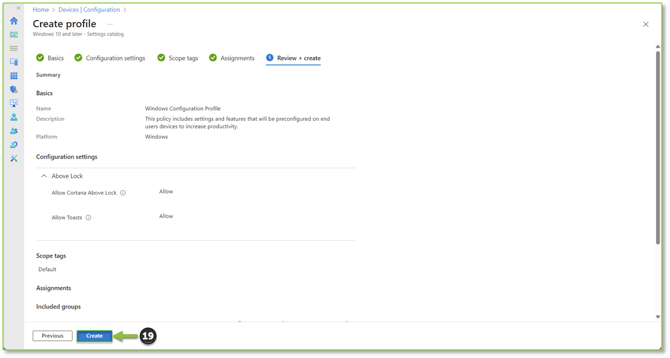 - The review page will allow you to see all configured settings for the profile type creation process, if you detect a discrepancy at this stage make note of the section and select Previous to go back to make the necessary alterations before finalization. If everything checks out, select Create to publish the rule.