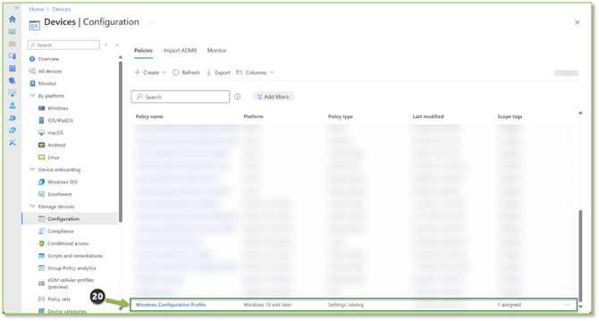 - Upon successful creation the rule will show up in the list of all configuration profiles managed through Intune.