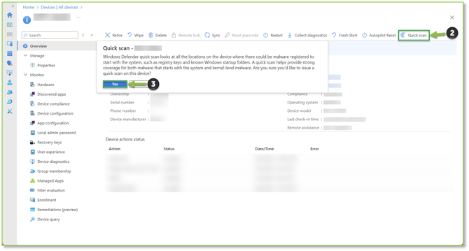- From the device Overview page, select the Quick Scan action, a prompt will generate asking if you are sure you want to follow through with initiating a Windows Defender quick scan on the device, select Yes to complete the Windows Defender quick scan action initiation process.