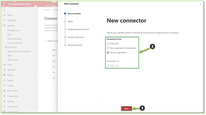 - A panel will open that will ask for specification of either inbound or outbound mail flow for the connector rule to apply to. Select Next once the mail flow has been determined.