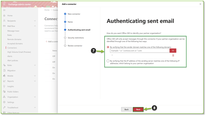 - Microsoft will ask for you to supply either the domains of organizations you are expecting emails from or the IP addresses they will be utilizing. Select Next when complete.