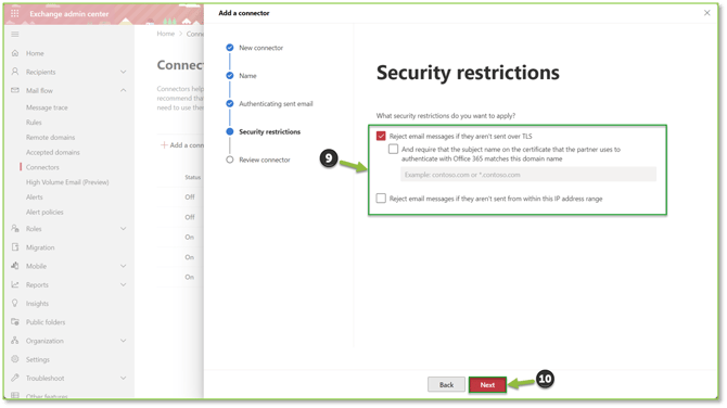 - You can provide restrictions on email delivery if it is not sent through a TLS tunnel or if the IP address of the sender is not included in the previous step. Select Next when complete.