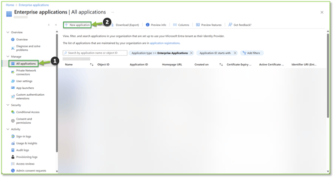 - Navigate to the Enterprise Applications – Azure Active Directory portal, locate and select the All Applications tab. A list of all connected enterprise applications that have been configured for your organization will be listed. Select the + New Application action to add a new app.
