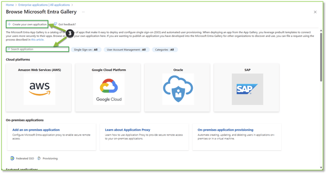 - Selecting the action above will display the Browse Microsoft Entra Gallery page, here you will see tiles for cloud platforms, on-premises applications, and featured applications. You can either manually traverse the gallery or utilize the search bar to search for a desired application to see if an existing Microsoft integration exists for it. If you cannot find an existing integration, you can select the + Create your own application action to manually create an integration for your application with your organization.