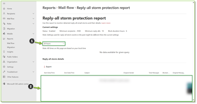 - Navigate to the Reply-all Storm Protection Report – Exchange Admin Center portal, here you will be able to view any detected reply-all storms that have been detected in your organization and any messages that have been blocked as a result. You will be able to specify a timeframe for up to a month if desired, if no data is available that indicates that no reply-all storms have taken place within your environment.