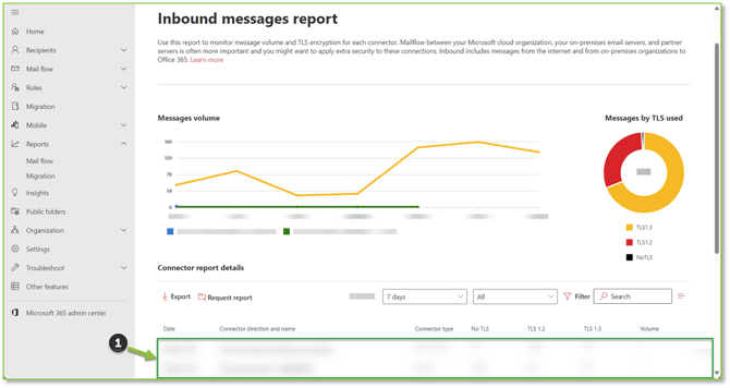 - To verify if an inbound enforced connector is positively or negatively impacting mail flow into your organization, we will want to navigate to the Inbound Messages Report – Exchange Admin Center portal, here you will be able to view inbound mail flow for the last seven days. Information related to TLS enforcement or lack thereof depending on connector enforcement will be displayed along with volumetric data on each inbound connectors' usage, this information can be utilized to determine if the security configuration of the connector is being deployed properly.