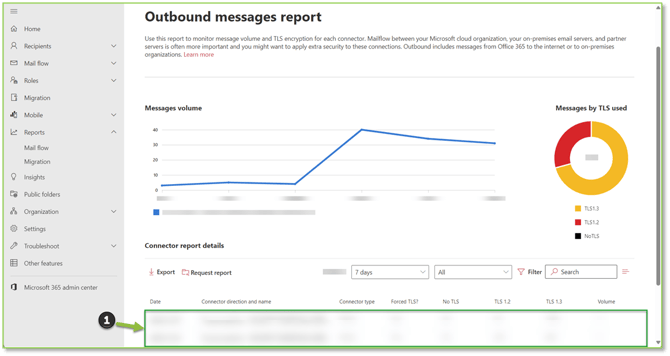 - To verify if an outbound enforced connector is positively or negatively impacting mail flow leaving your organization, we will want to navigate to the Outbound Messages Report – Exchange Admin Center portal, here you will be able to view outbound mail flow for the last seven days. Information related to TLS enforcement or lack thereof depending on connector enforcement will be displayed along with volumetric data on each outbound connectors' usage, this information can be utilized to determine if the security configuration of the connector is being deployed properly.
