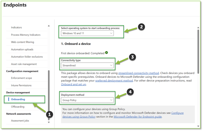 - Navigate to the Endpoint Onboarding – Microsoft Defender portal, from this page specify the Operating System as Windows 10 and 11, Connectivity Type as Streamlined, and the Deployment Method as Group Policy.