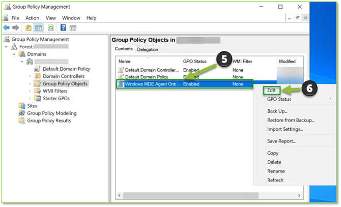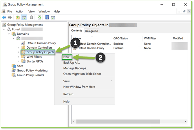 - On the Domain Controller where desired Windows Devices that are wishing to MDE join are connected. Open the Group Policy Management Console (GRMC), once opened we will want to locate the Group Policy Objects under our desired Right-click and select New.