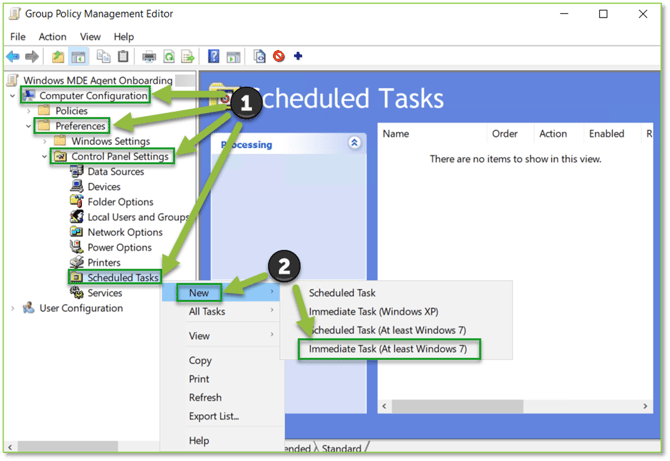 - This will open the Group Policy Management Editor, from the new window, we will want to traverse the directory until we get to the Scheduled Tasks section under Computer Configuration --> Preferences --> Control Panel Settings. Once there, right-click Scheduled Tasks, select New --> Immediate Task (At least Windows 7).