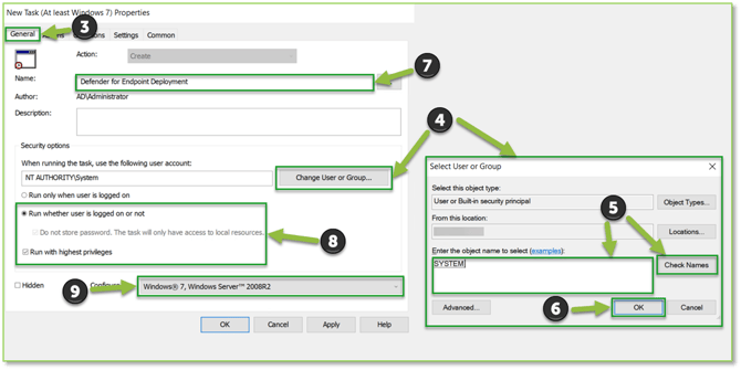 - In the Task window that opens, go to the General Under Security options select Change User or Group, within the User or Group window type SYSTEM and then select Check Names followed by OK. NT AUTHORITY\SYSTEM appears as the user account the task will run as. In the Name field, type an appropriate name for the scheduled task such as Defender for Endpoint Deployment. Select Run whether user is logged on or not and check the Run with highest privileges check box. Specify the desired Windows Server OS that your File Server is currently running off under the Configure for drop-down.