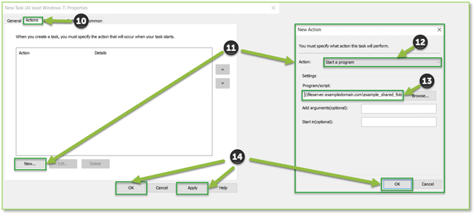 - After the configuration items have been implemented under the General tab, we will locate the Actions tab, we will select New… Once the New Action window opens verify that Start a program is selected from the Action dropdown. We will want to supply the UNC path, using the file server’s fully qualified domain name, of the shared extracted WindowsDefenderATPOnboardingScript.cmd file. Select OK to confirm the action that the task will perform, the action will generate in the list, we will want to select Apply to save our configured settings and then select OK to complete the Scheduled Tasks deployment. Close out of any Group Policy Management windows.