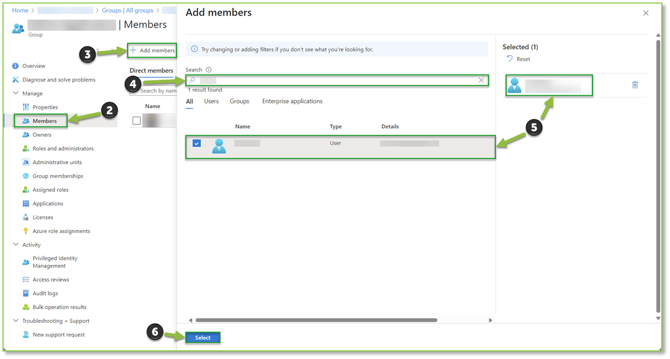 - From the Overview page of the selected Group, locate and select the Members tab. Locate and select the Add Members action. A pop-up will be displayed where you will supply the name of the user in the provided search bar, make sure to select the User from the list. If done correctly they will be generated in the Selected Items section, finalize the addition by clicking Select.