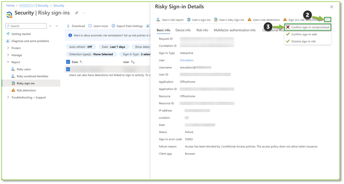 - From the Risky Sign-in Details flyout, select the three dots followed by selecting the Confirm sign-in compromised action. This action should be taken after investigating and confirming that the sign-in attempt was a true positive.