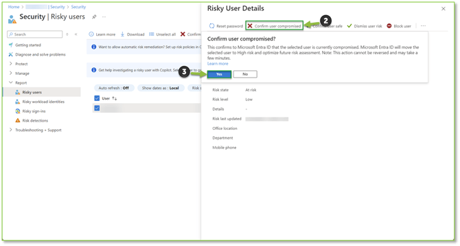 - From the Risky User Details flyout, select the Confirm user compromised action. This action should be taken after investigating and confirming that the user account is compromised. A disclaimer will be displayed detailing that the user risk will be set to high, and a new detection will be added. Select Yes to identify the user risk as real. If a risk-based conditional access policy wasn’t triggered and the risk wasn’t self-remediated as a result, you will need to carry out additional actions such as conducting a User Block, Password Reset, Revoking Active Sessions, Resetting MFA, Reregistering MFA, etc.