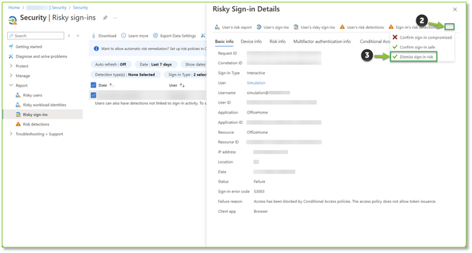 - From the Risky Sign-in Details flyout, select the three dots followed by selecting the Dismiss sign-in risk action. This action should be taken after investigating and confirming that the sign-in attempt was real but not malicious.