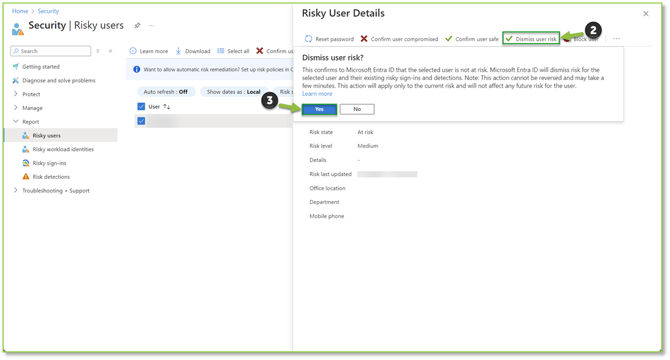 - From the Risky User Details flyout, select the Dismiss user risk action. This action should be taken after investigating and confirming that the user account isn't at risk of being compromised. A disclaimer will be displayed detailing that the user will no longer be seen as at risk, and all the risky sign-ins of this user and corresponding risk detections will be dismissed as well select Yes to identify the user risk as real but not malicious.