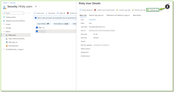 - From the Risky User Details flyout, select the Unblock user action. This will reinstate the ability for the user account to successfully authenticate during sign-in prompts or the ability to successfully complete MFA prompts. The Unblock user action should only be executed once the necessary remediation steps for the compromised account have been successfully completed.