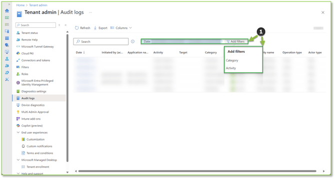 - Navigate to the Audit Logs – Intune portal, here you will find logs that include a record of activities that generate a change, for example any create, update (edit), delete, assign, and remote actions all generate events. Administrators can review the audit logs to track and monitor events for almost every Intune workload. If you are looking for a specific event based on a classification such as a date, category, or activity, you can utilize the provided filters as desired to return the results you need.