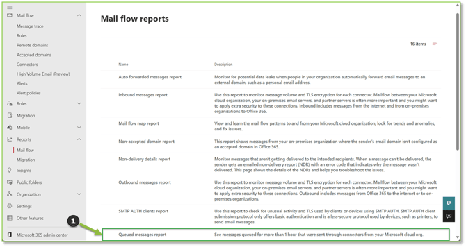- Navigate to the Mail Flow Reports – Exchange Admin Center portal, locate and select the Queued Messages Report. A pop-out will be displayed where you will be able to view information related to the connector that is having issues delivering mail as well as possible troubleshooting solutions recommended by Microsoft to remediate the delivery errors. If there are no messages queued for mail delivery failure, there will be no data displayed in the pop-out.