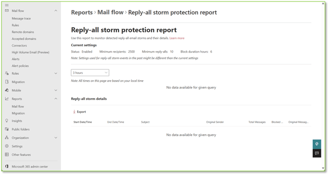 - Navigate to the Reply-All Storm Protection Report – Exchange Admin Center This report will display all the possible reply-all storms that have been detected within the system as well as all of the reply-all messages that have exceeded the default thresholds and have been blocked as a result.