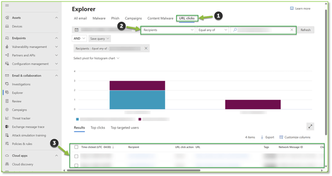 - Navigate to the Explorer – Microsoft Defender portal, verify that the URL Clicks tab is selected. Utilizing the supplied fields for applying filters, specify the necessary drop downs to reflect Recipients, Equals Any Of, and lastly supply the User Address that was designated within the generated A user clicked through to a potentially malicious URL alert. Hitting Enter will propagate a list of URLs click actions that have been carried out by the designated user, here you will be able to analyze URLs that could house malicious content.