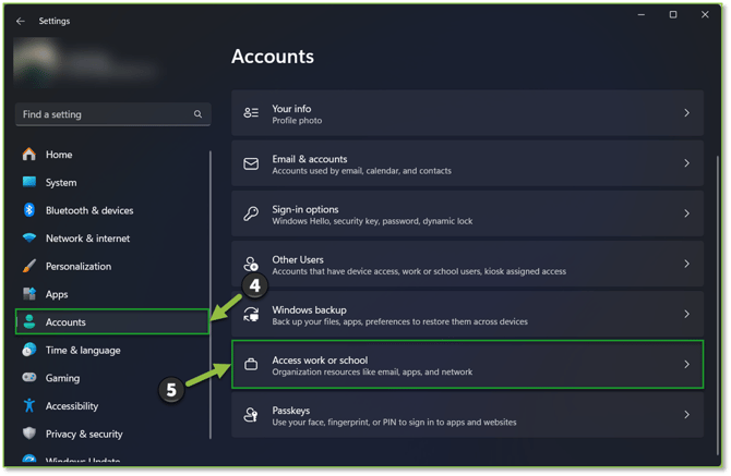 - From the Home section of the Settings window, we will want to relocate to the Accounts section, here we will want to locate and select the Access work or school subsection.