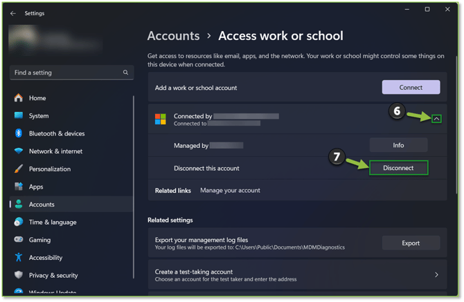- Once inside the Access work or school subsection, we will want to select the dropdown next to the displayed Connected by [UPN] / Connected to [Microsoft Tenant]. This will show the Disconnect this account option, select Disconnect to self-revoke access to company resources.