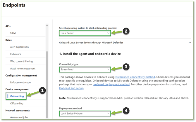 - Navigate to Endpoint Onboarding – Microsoft Defender portal, from this page specify the Operating System as Linux Server, Connectivity Type as Streamlined, and the Deployment Method as Local Script (Python).