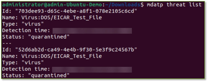 - If done correctly, the files should be quarantined by the MDE agent running on the device, this can be checked by leveraging the command below to list all detected threats.