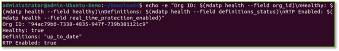 echo -e "Org ID: $(mdatp health --field org_id)\nHealthy: $(mdatp health --field healthy)\nDefinitions: $(mdatp health --field definitions_status)\nRTP Enabled: $(mdatp health --field real_time_protection_enabled)"