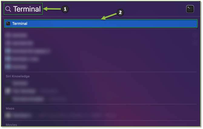 - On the desired macOS Device that you wish to Offboard, access the Spotlight Search functionality, provide Terminal within the search field. Locate and select the utility to begin.