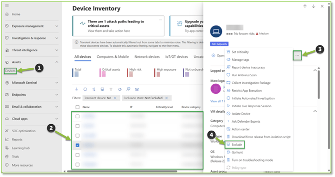 - Navigate to the Device Inventory – Microsoft Defender portal, here we will want to locate the device that has successfully completed the local offboarding process. Selecting the device will display a pop-out outlining the system information. We will want to select the three dots option to view more actions, from the generated list we will want to locate and select Exclude.
