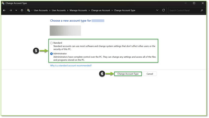 - With the user selected, the Account panel opens—choose the Change the account type action.